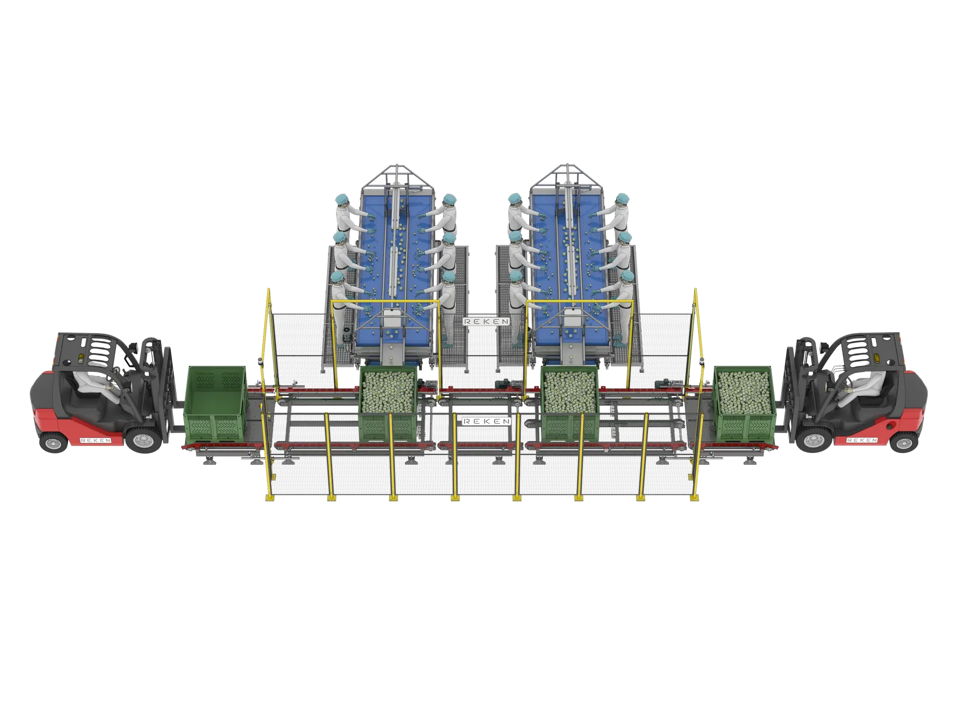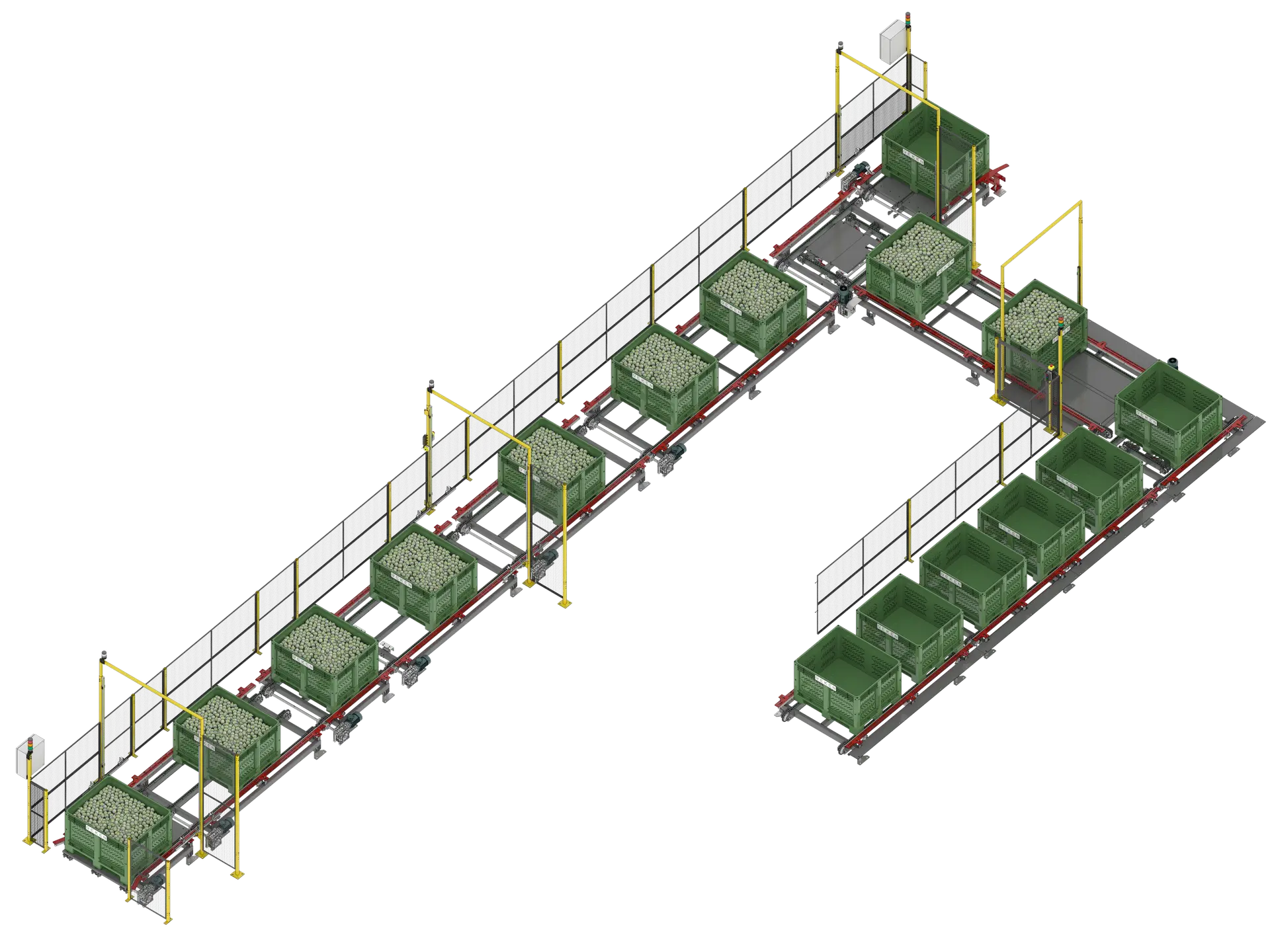 Transport wewnętrzny i logistyka skrzyń stanowią ostatnie ogniwo w łańcuchu przetwarzania i pakowania warzyw. Odpowiadają za płynne przemieszczanie surowca, półproduktów i gotowych opakowań między sekcjami linii, a także za automatyczny obrót skrzyniopalet, pojemników i palet w obrębie zakładu. Rozwiązania REKEN zapewniają pełną integrację z systemem sterowania i dopasowanie do indywidualnych układów hal produkcyjnych.
